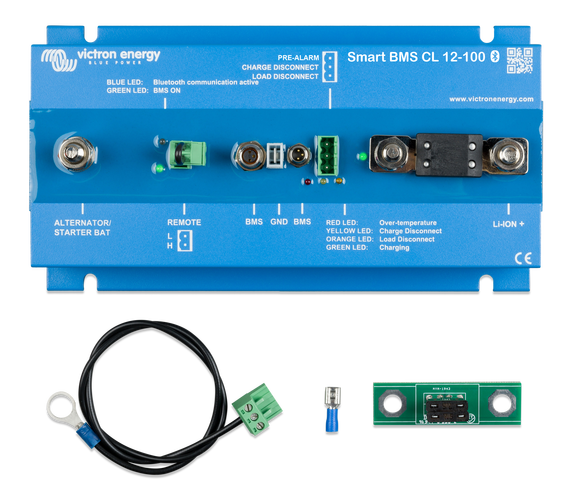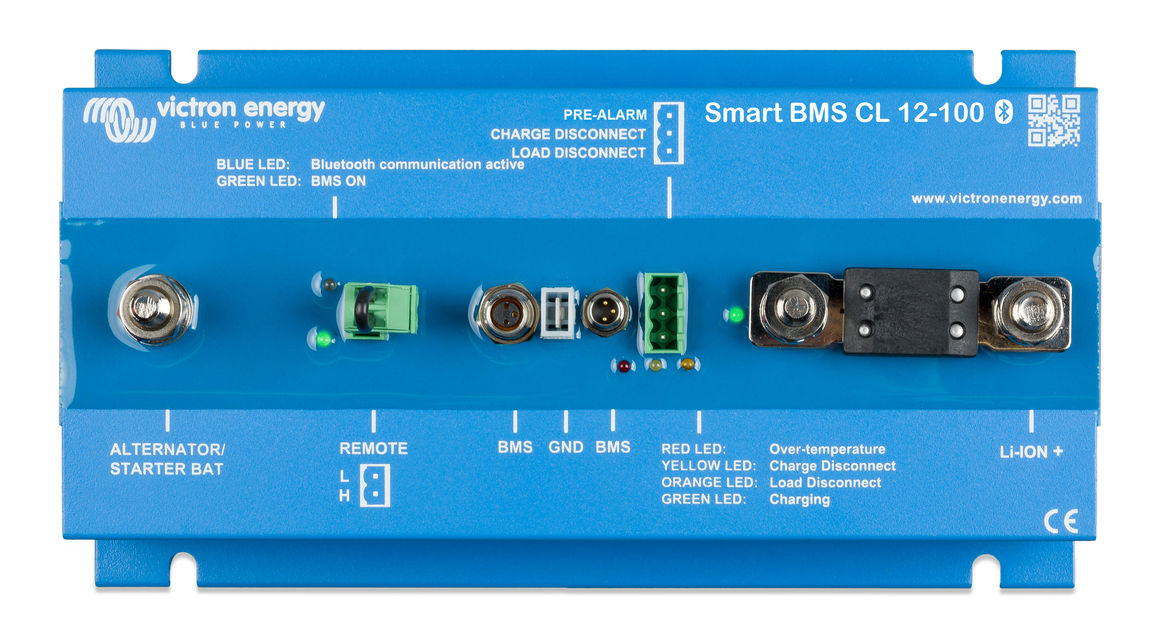 Il BMS CL 12-100 monitorizza e protegge ogni singola cella della batteria (o del banco batterie) e scollega l'alternatore, le fonti di carica o i carichi in CC in caso di bassa tensione batteria, alta tensione batteria o sovratemperatura.