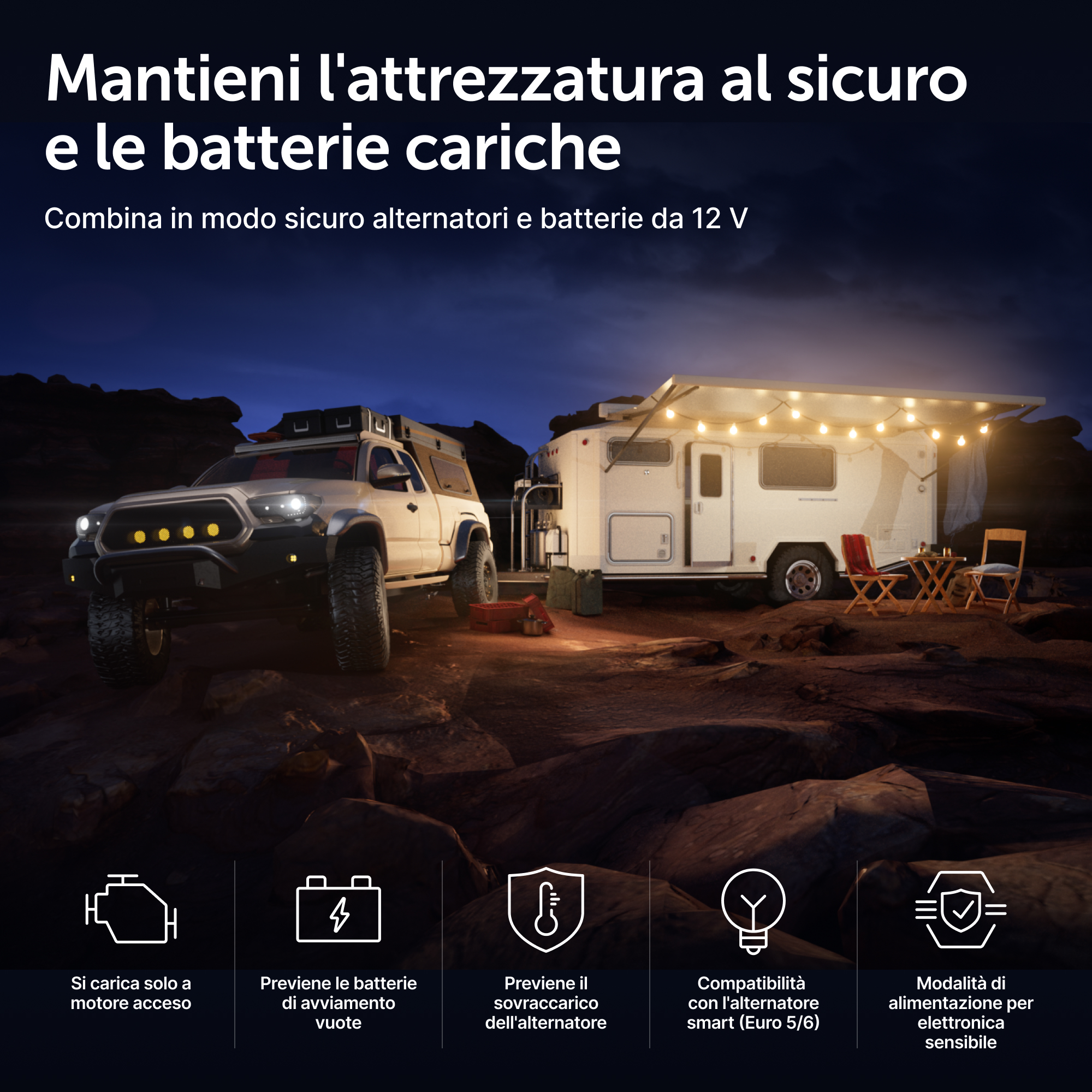 Che tu sia fuori rete per un fine settimana avventuroso o per una spedizione completa, l'Orion XS mantiene le batterie di servizio cariche e protette. Funziona con alternatori intelligenti, è disponibile nei modelli a 12V e 12/24V e si adatta perfettamente a spazi ristretti.
