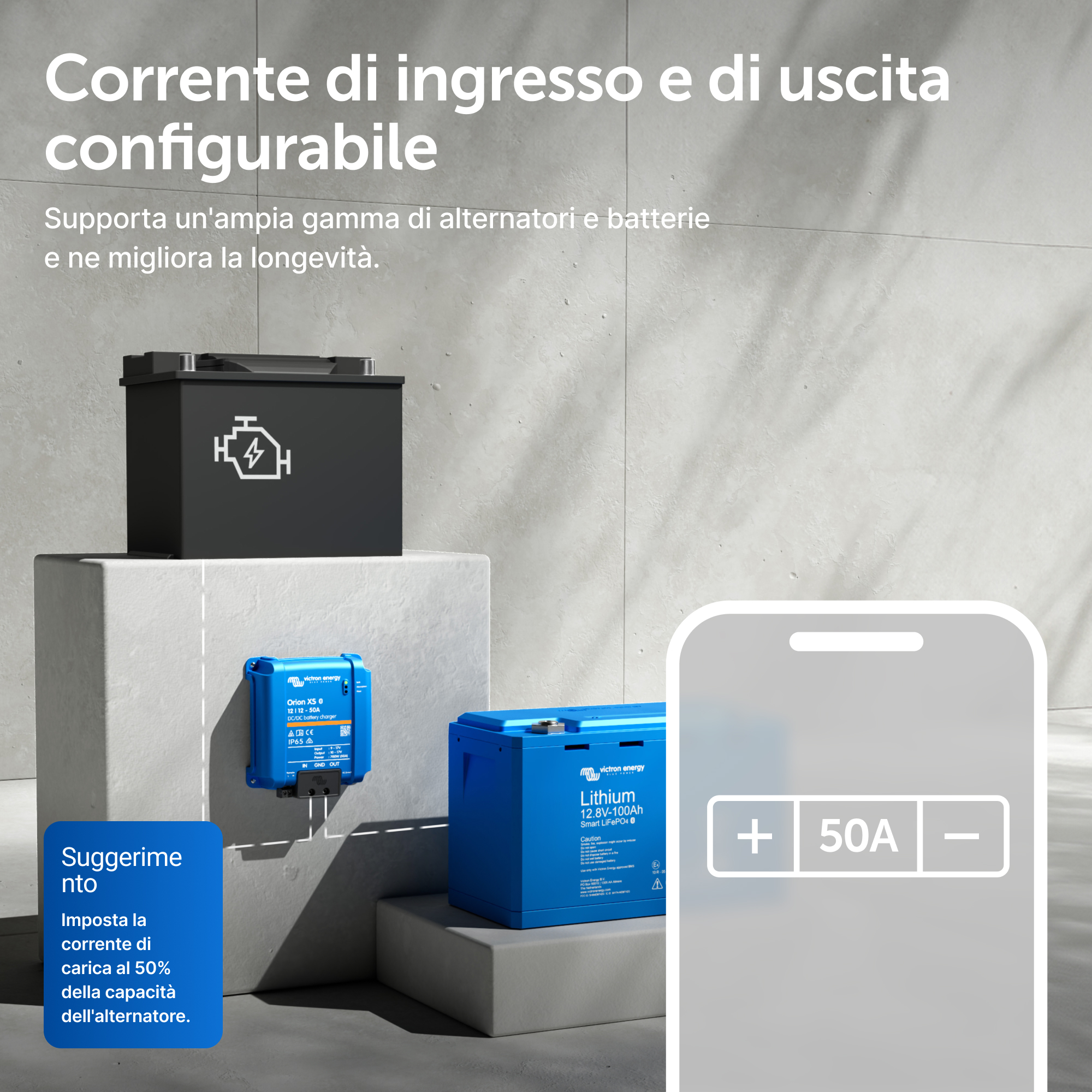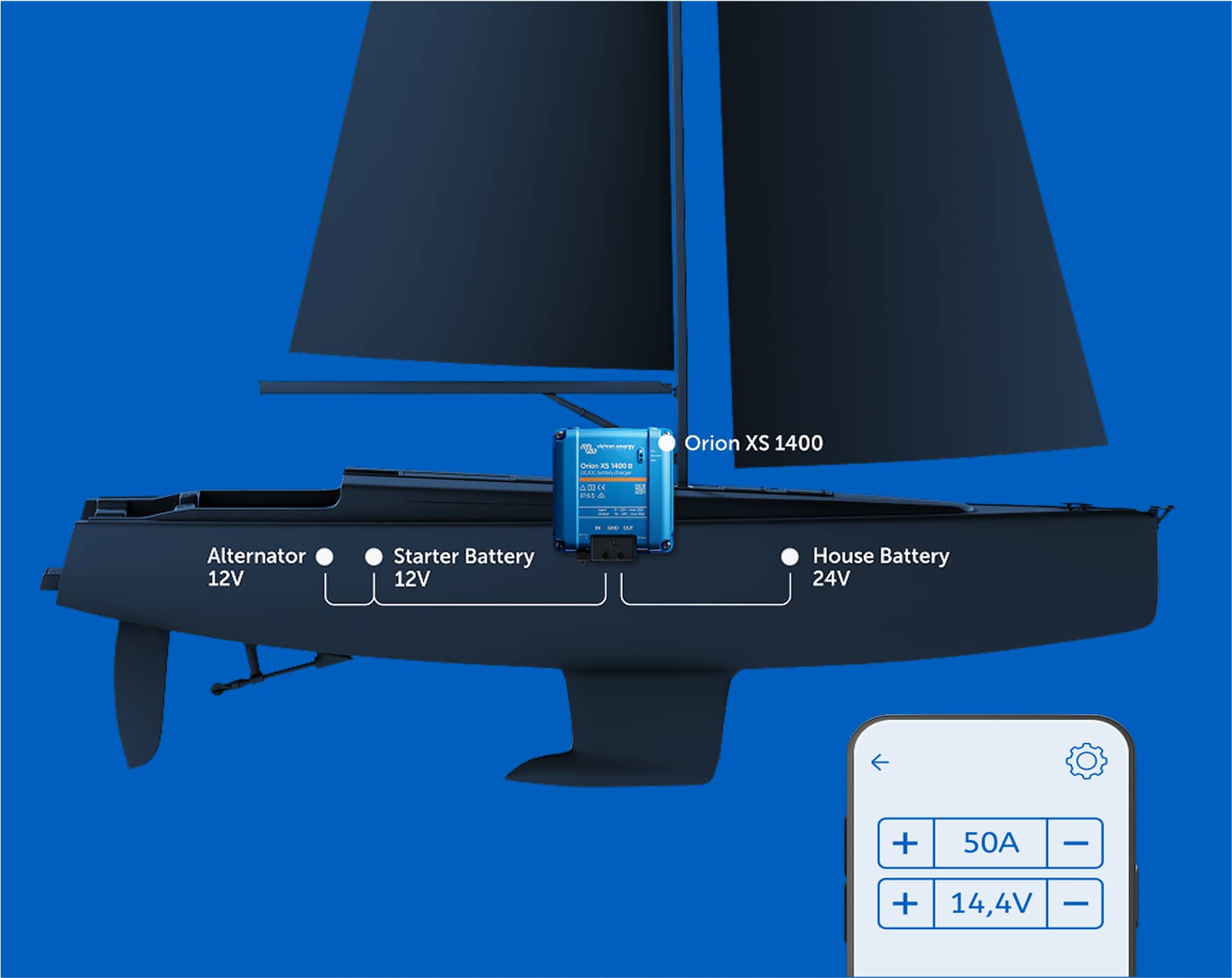 La corrente di ingresso può essere limitata con precisione per prevenire il sovraccarico dell'alternatore. La tensione di carica è completamente configurabile per adattarsi a batterie al litio, AGM, Gel e altre composizioni chimiche. Per i sistemi a tensione mista, l'Orion XS 1400 fornisce anche la conversione da 12 V a 24 V o da 24 V a 12 V.