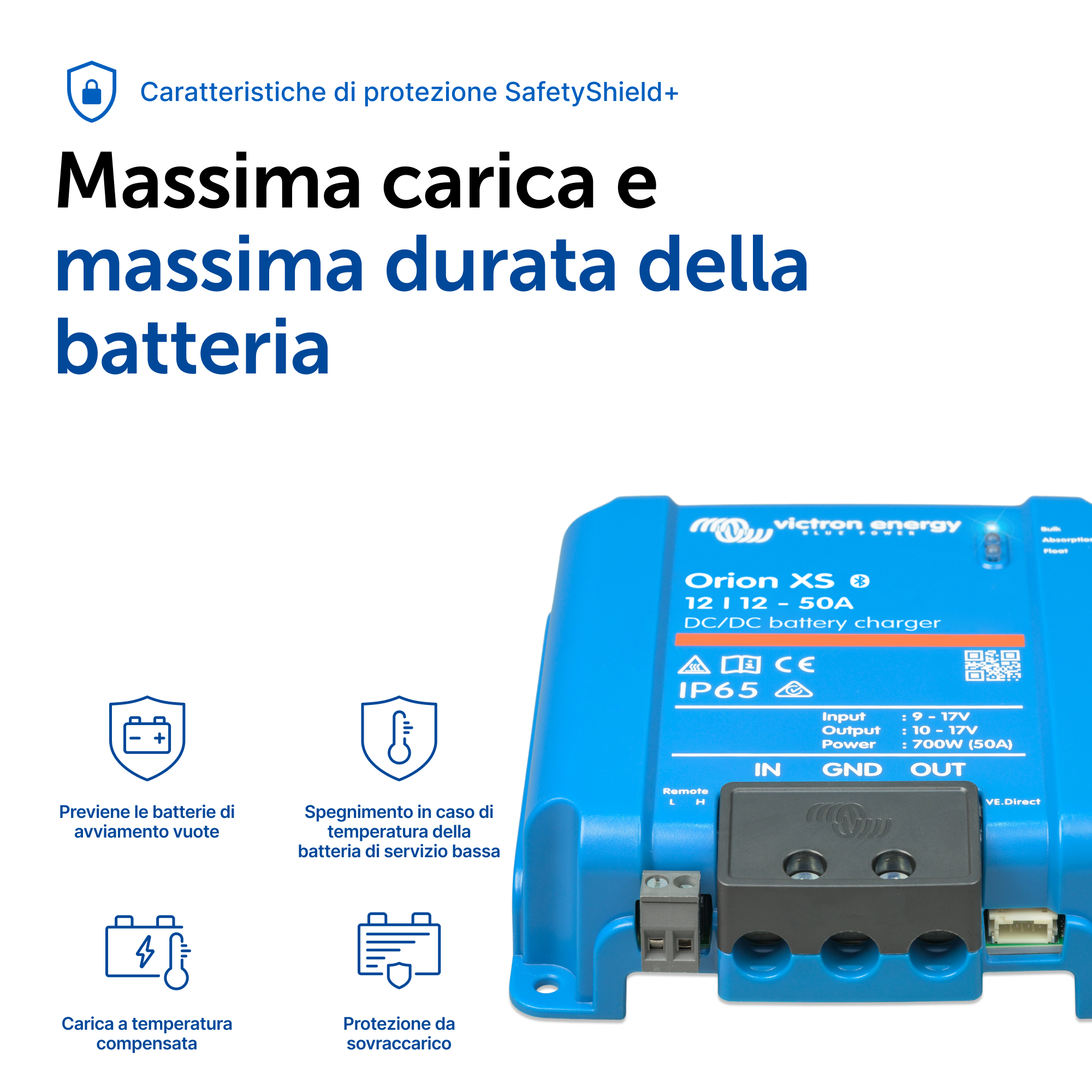 Progettato per applicazioni critiche, l'Orion XS è dotato di protezione IP65 contro acqua e polvere, carica compensata in temperatura e protezioni complete contro sovraccarico, cortocircuiti, sovraccarica e surriscaldamento.