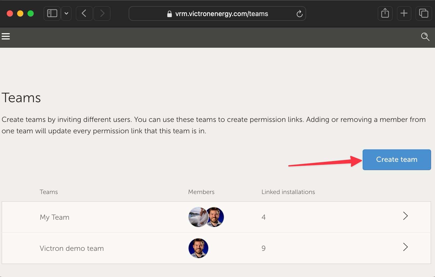 Depois de criar a equipa nova e de adicionar outros utilizadores, a equipa aparece na página de equipas. A partir daí, clicar para abrir a equipa permite adicionar outros utilizadores e também associar instalações específicas e grupos de instalação.