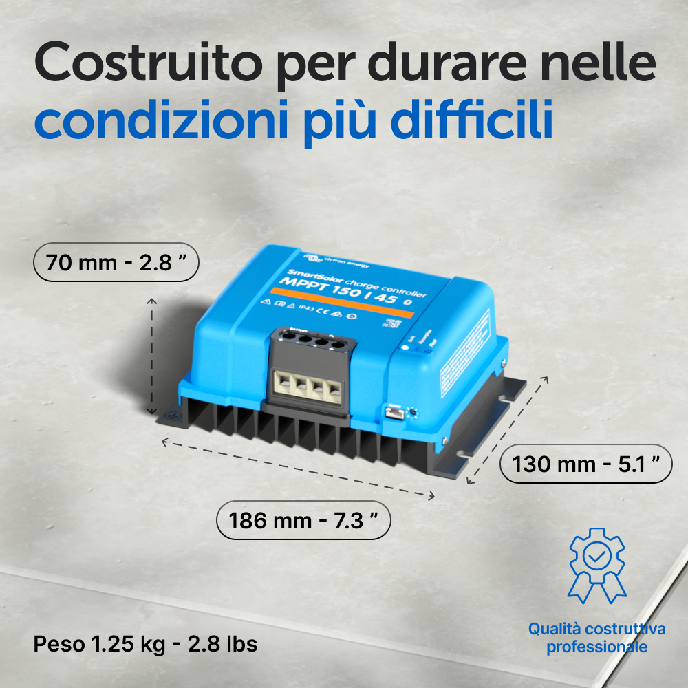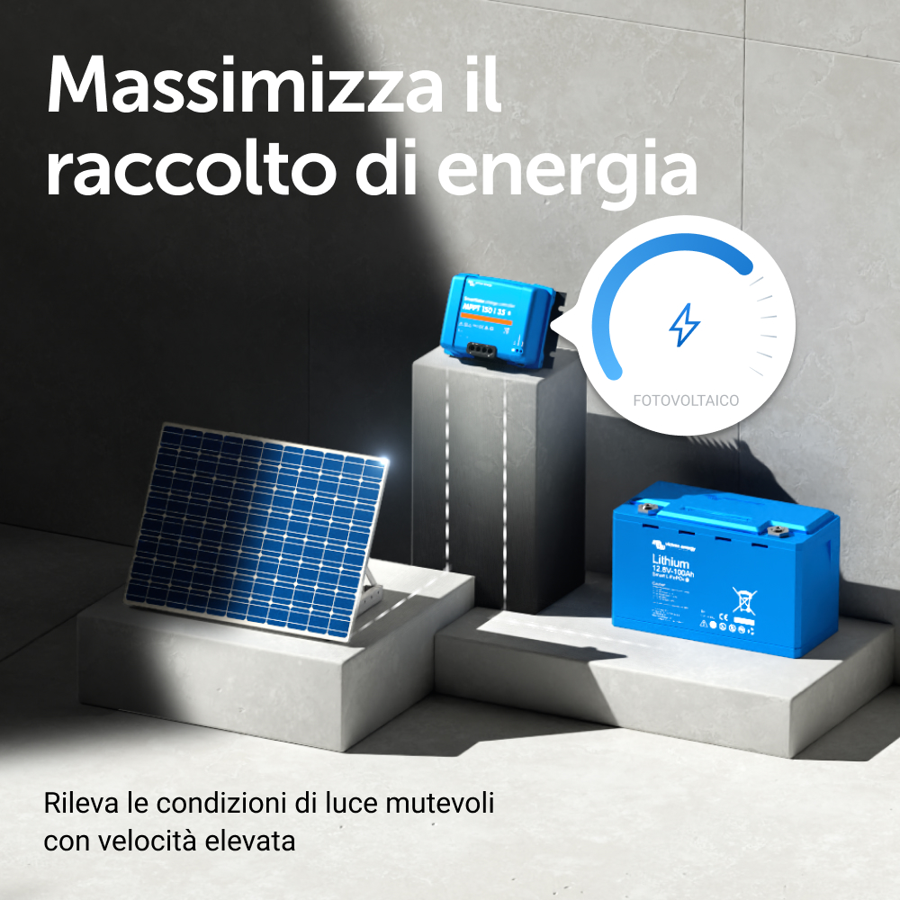 Lo SmartSolar MPPT estrae ogni briciolo di energia dalla luce solare, anche in condizioni di ombra parziale, grazie al tracciamento del punto di potenza estremamente rapido e agli algoritmi di carica intelligenti.