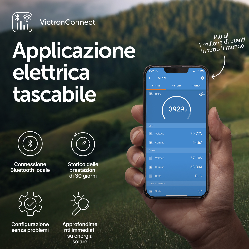 Iniziate a utilizzare subito VictronConnect, la nostra applicazione per smartphone facile da usare e apprezzata da milioni di persone in tutto il mondo. Le numerose preimpostazioni della batteria agevolano la configurazione di sistemi nuovi o esistenti, mentre l'app consente di controllare funzioni come le impostazioni di uscita del carico, i profili di carica e il monitoraggio delle prestazioni in tempo reale.