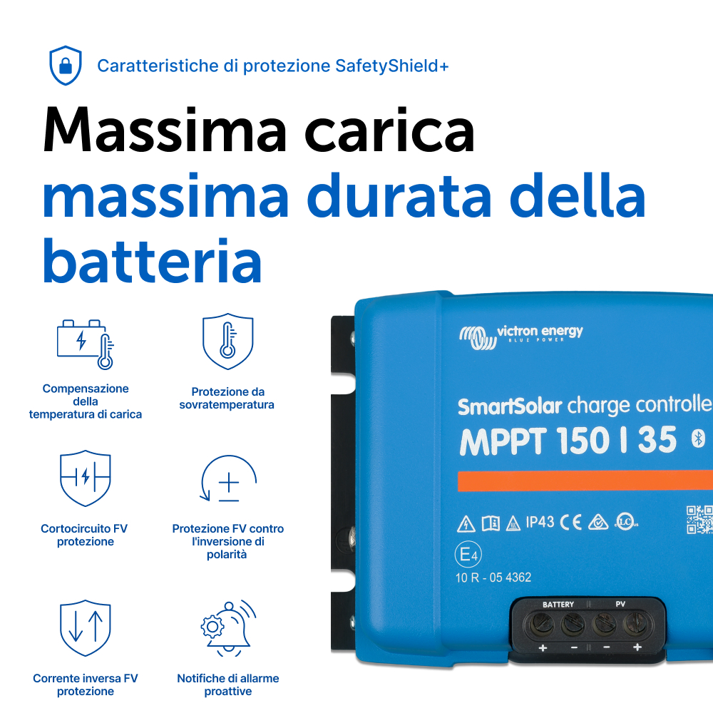 Lo SmartSolar MPPT dà priorità alla cura della batteria, grazie alle funzioni SafetyShield+ integrate, basate su decenni di conoscenze in materia di batterie. Tali funzioni comprendono la carica a temperatura compensata, la protezione da sovratemperatura, le protezioni contro i cortocircuiti del FV, l'inversione di polarità e la corrente inversa.